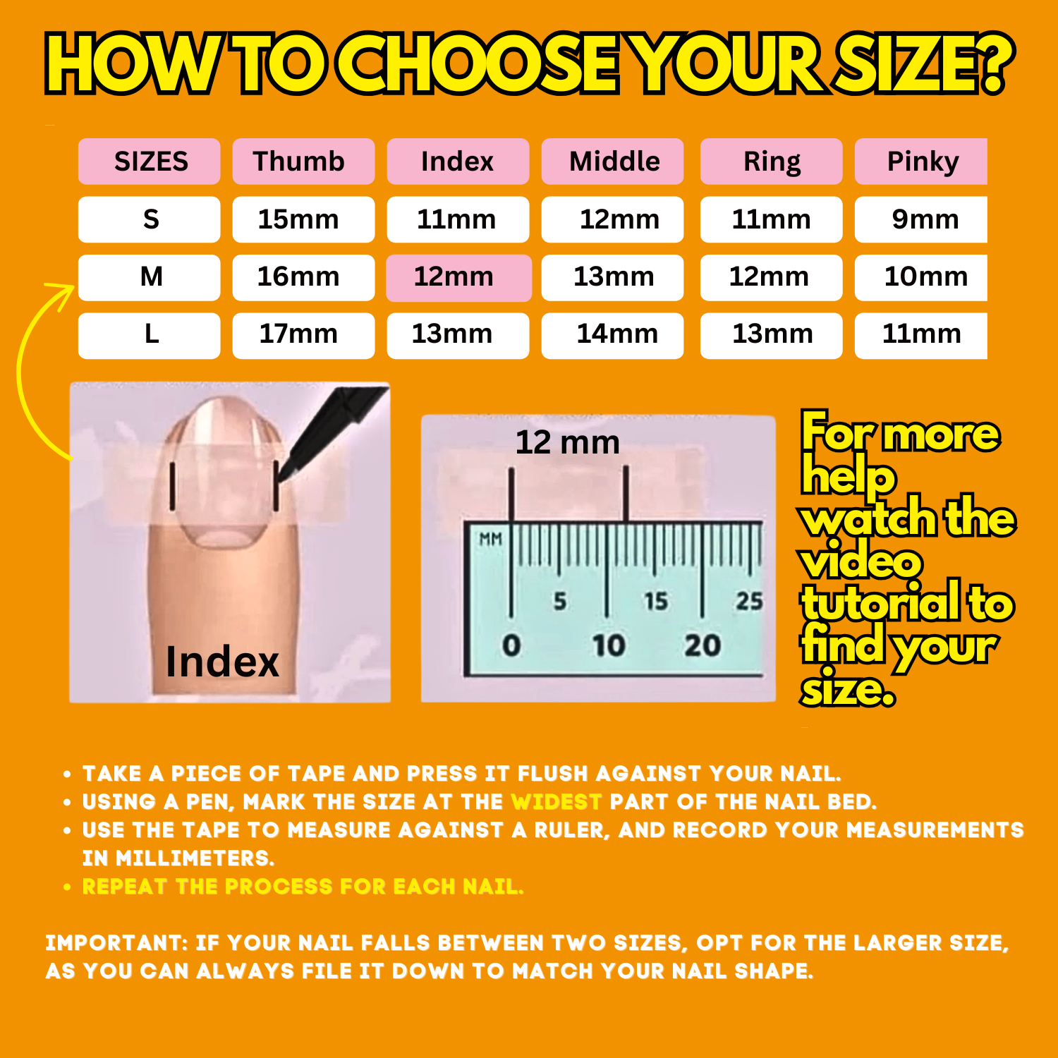 - How to Choose Your Size: Everyone’s nails are unique, but our sizes are designed to fit surprisingly well. We offer three sizes: Small, Medium, and Large. To find the best fit, simply measure the width of each of your nails and refer to our size chart. For additional help, check out our videos for tips on selecting the perfect size. Pro Tip: If you're between sizes, we recommend choosing the larger size—you can easily file the edges to customize the fit and match your natural nail shape perfectly.