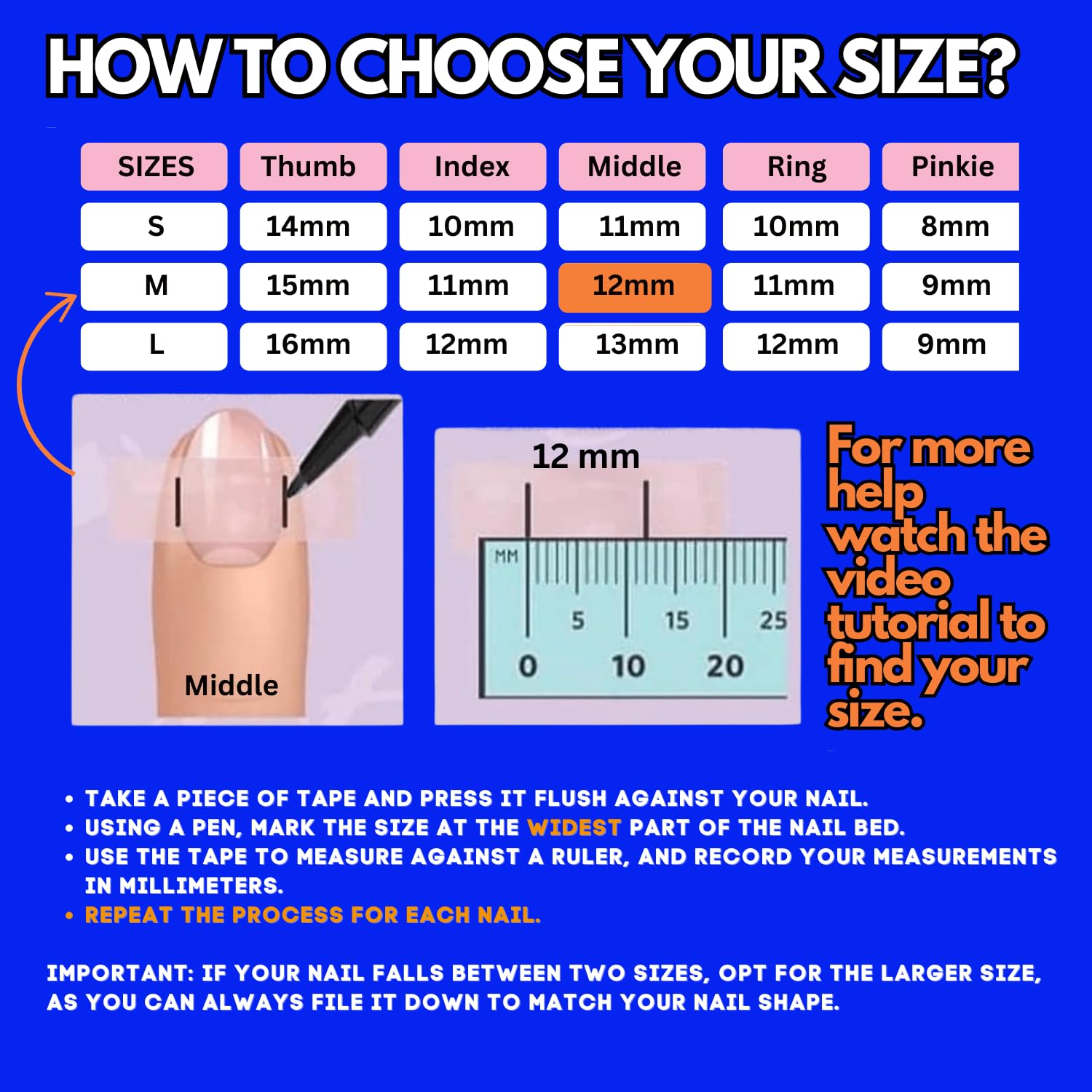 - How to Choose Your Size: Everyone’s nails are unique, but our sizes are designed to fit surprisingly well. We offer three sizes: Small, Medium, and Large. To find the best fit, simply measure the width of each of your nails and refer to our size chart. For additional help, check out our videos for tips on selecting the perfect size. Pro Tip: If you're between sizes, we recommend choosing the larger size—you can easily file the edges to customize the fit and match your natural nail shape perfectly.