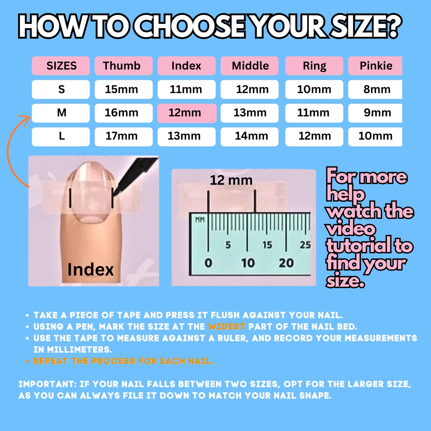 - How to Choose Your Size: Everyone’s nails are unique, but our sizes are designed to fit surprisingly well. We offer three sizes: Small, Medium, and Large. To find the best fit, simply measure the width of each of your nails and refer to our size chart. For additional help, check out our videos for tips on selecting the perfect size. Pro Tip: If you're between sizes, we recommend choosing the larger size—you can easily file the edges to customize the fit and match your natural nail shape perfectly.